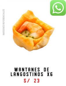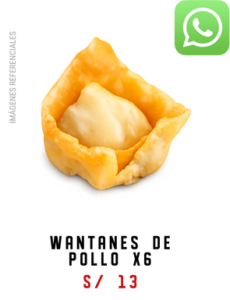 Seis wantanes crujientes y dorados, bien rellenitos de pollo.